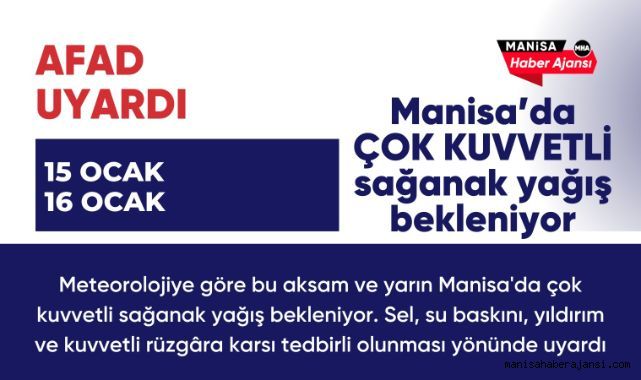AFAD'ın açıklamasına göre, Manisa'da bu akşam saat 20.00'den itibaren ve yarın gün boyu kuvvetli sağanak yağış bekleniyor. Yağışların yer yer aşırı olması bekleniyor.