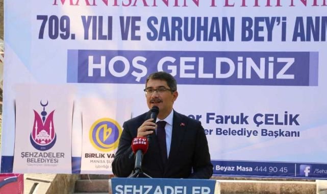 Daha sonra katılımcılara hitap eden Şehzadeler Belediye Başkanı Ömer Faruk Çelik "Manisa’nın, 1313 yılı 25-26 Ekim tarihlerine denk gelen bir Regaip Kandili gecesi Anadolu’ya gelen Türkmen Beyleri’nden Alpagu oğlu Saruhan Bey komutasındaki askerler tarafından fetih edilişinin 709. yılı kutlu olsun." dedi. Başkan Çelik sözlerini şöyle sürdürdü; " Bu fetih; 1071’de Malazgirt’te başlayan Anadolu’daki kutlu yürüyüşümüzün ulaştığı yeri ve ecdadımızın “ilayı kelimetullah” uğruna bitmek, tükenmek bilmeyen fetih aşkının bir göstergesi ve ömrümüzün Manisa’da geçecek günlerinin yol haritası olan kader çizgimizin önemli işaretlerinden biridir. Sadece Manisa’nın yaşadığı 709 yıllık tarihi serüvende; insan, vatan ve devlet konusunda düşünmesini ve akıl etmesini bilenler için muhteşem ve manidar nice dersler var! 26 Ağustos Malazgirt Zaferi’nin, 30 Ağustos Zafer Bayramı’nın, 8 Eylül Manisa’nın Kurtuluşu’nun, 25 Ekim Manisa’nın Fethi’nin ve 29 Ekim Cumhuriyet Bayramı’nın yıl dönümü. Bu önemli tarihler bize şunu anlatıyor; vatan, millet ve istiklal ve istikbal şuuru olan milletler, yüz yıllara meydan okuyarak varlıklarını sürdürebilirler. Diğerleri tarihte bir anı olarak kalmaya mahkumdur. Manisa’nın fethi; hak, adalet ve hukuk tanımayan, insana saygısını yitirmiş ve kokuşmuş bir medeniyetin yerini insan merkezli, hak dostu ve güzel ahlakla taçlanmış bir sevgidir. Atalarımız ‘yaratılanı yaratandan ötürü sevdiler’. İnananı kardeş, inanmayanı Allah’ın emaneti bildiler ve herkese eşit muamele yaptılar, hoşgörüyle baktılar. Din, dil, ırk ayrımından uzak durdular. İnsan olmayı en büyük şeref bildiler. Yıkan değil yapan bir medeniyet kurdular.