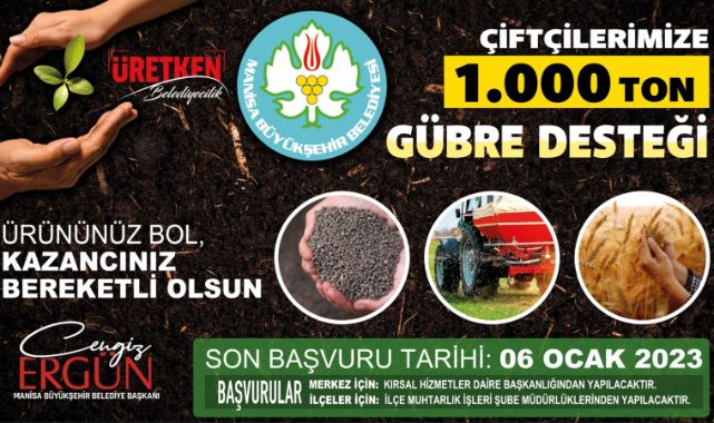 Manisa Büyükşehir Belediye Başkanı Cengiz Ergün, kırsal kalkınmaya yönelik desteklerinin aralıksız devam ettiğini belirterek, çiftçilere yeni bir müjdeyi de Büyükşehir Belediye Meclis Toplantısı’nda verdi. Başkan Ergün, daha önce üreticilere 291 ton gübre desteği sağladıklarını hatırlatarak, 2023 yılında 13 milyon liralık bütçeyle bu desteğin 1000 ton olacağını ifade etti.