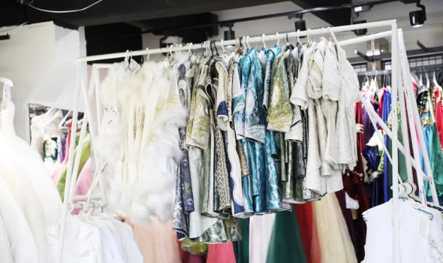 Mağazada gelinlik, bindallı, sünnet kıyafeti ve nişanlıklar vatandaşların kullanımına sunuluyor.