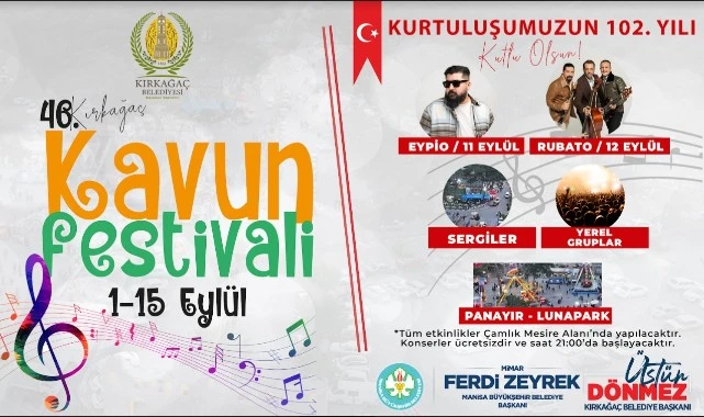 Anahtar Kelimeler: Kırkağaç Kavun Festivali, Kırkağaç kurtuluş yıl dönümü, 102. kurtuluş yılı, Eypio ve Rubato konserleri, Manisa Büyükşehir Belediyesi, Kırkağaç Belediye Başkanı Üstün Dönmez, Çam Mesire Alanı, Kırkağaç etkinlikleri, Kırkağaç kavunu, Kırkağaç kültürel zenginlikler.