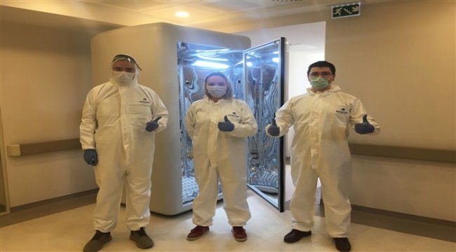 “UVC dezenfeksiyon kabininde gerçekleştirdiğimiz canlılık deneylerinde, kullandığımız model hücrenin 30 saniye gibi çok kısa bir sürede yüzde yüze varan oranlarda öldüğünü gözlemledik. Bundan daha önemli olan, siperlik, gözlük, eldiven, koruyucu elbise gibi korunma ekipmanlarıyla (KKE) donanmış sağlık çalışanlarının etkilenmediğini de testlerle kanıtladık. Yaptığımız tasarımda kullandığımız ozon sistemi sayesinde, UVC’nin nüfuz etmediği bölgelerde oldukça etkin bir viral yük azaltması gerçekleştirdiğini deneysel olarak da gösterdik.”