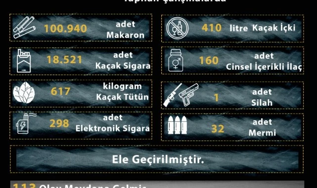 100.940 Adet Makaron, 18.521 Adet Kaçak Sigara, 298 Adet Elektronik Sigara ve Emtia, 617 Kilogram Kaçak Tütün, 410 Litre Kaçak İçki, 160 Adet Cinsel İçerikli İlaç, 1 Adet Silah ve 32 Adet Mermi Ele Geçirilmiştir.