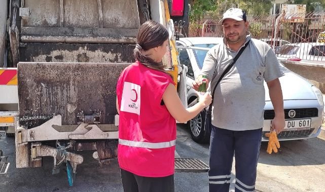 Türk Kızılay Manisa Şubesi ekip ve gönüllüleri tarafından, kent merkezinde sıcak havada çalışan işçilere, Kızılay Maden Suyu, su ve kek ikram edildi.