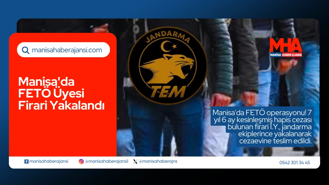 Manisa İl Jandarma Komutanlığı Terörle Mücadele (TEM) Şube Müdürlüğü ekipleri, FETÖ/PDY silahlı terör örgütüne üye olma suçundan 7 yıl 6 ay kesinleşmiş hapis cezası bulunan firari şahsı yakaladı.