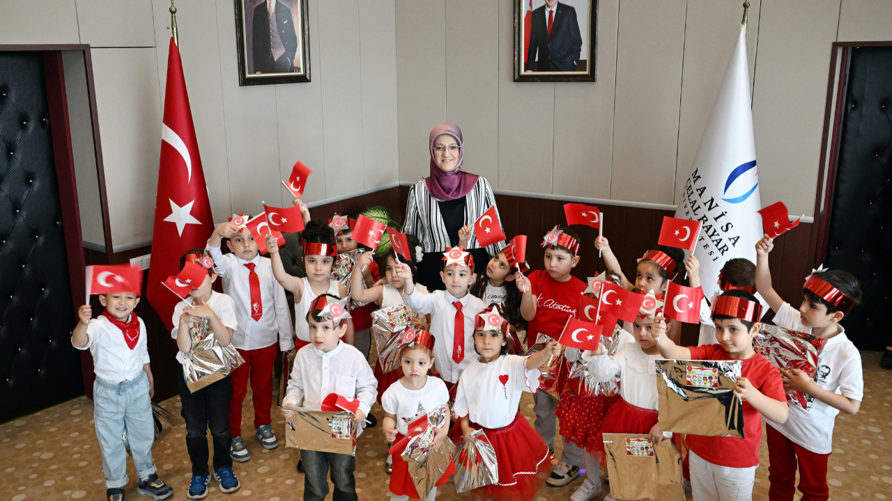 Manisa Celal Bayar Üniversitesi’nde, 23 Nisan Ulusal Egemenlik ve Çocuk Bayramı kutlamaları kapsamında Kreş Gündüz Çocuk Bakımevi öğrencileri, Rektör Prof. Dr. Rana Kibar’ı makamında ziyaret etti. Çocuklar, bayraklarla girip resim ve şiirler sundu, Rektör Kibar ise onlara koltuğunu sembolik olarak devretti.