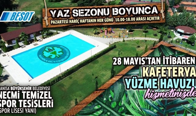 Manisa Büyükşehir Belediyesi tarafından şehre kazandırılan ve vatandaşların hoşça vakit geçireceği alanlardan bir tanesi olan Necmi Temizel Spor Tesisleri, 28 Mayıs Cumartesi günü itibariyle kapılarını vatandaşlara açacak. Manisalıların hizmetine sunulan havuz, Pazartesi günü hariç haftanın 6 günü ziyaretçilerini ağırlayacak. Saat 10.00-18.00 arası açık olacak tesiste, Manisalılar gün boyu serin sularda ve yeşilin içinde yazın tadını çıkarabilecek. Bunun yanı sıra tesis içerisinde yer alan kafeteryada da Manisalılar keyifle vakit geçirebilecek.