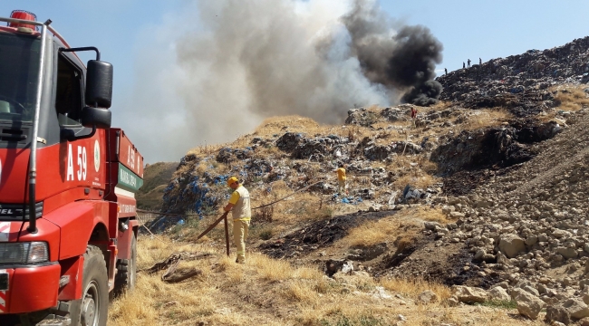 Manisa'nın Turgutlu ilçesinde çöplük alanında yangın çıktı. İtfaiye ekipleri yangını söndürme çalışıyor.