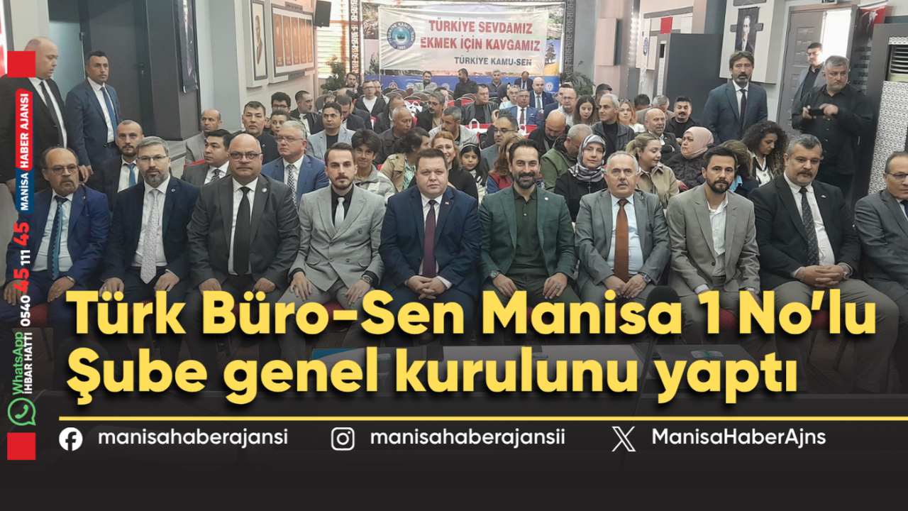 Türk Büro-Sen Manisa 1 No’lu Şubesi’nin 2. Olağan (8. Genel) Kurulu Manisa’da yoğun katılımla gerçekleştirildi. Toplantıya AK Parti MKYK Üyesi ve Manisa Milletvekili Mücahit Arınç, MHP Manisa İl Başkanı Cüneyt Tosuner, Türk Büro Sen Genel başkan yardımcısı Nebi Yay, SGK Manisa İl Müdürü Kenan Erkol, Akhisar Nüfus Müdürü Yunus Soyalan, Şehzadeler Merkez Müdürü Ülker Kabadağ, Ülkü Ocakları İl Başkanı Emirhan Sallıtepe, Türkiye Kamu-Sen Manisa İl Temsilcisi Aydın Akagündüz, İzmir Türk Büro-Sen 1 No’lu Şube yöneticileri, Yunusemre İlçe Başkanı Bülent Kovancıoğlu ile çok sayıda delege ve kamu çalışanı katıldı. Başkan Ahmet Ağır açılış konuşmasını yaptı .