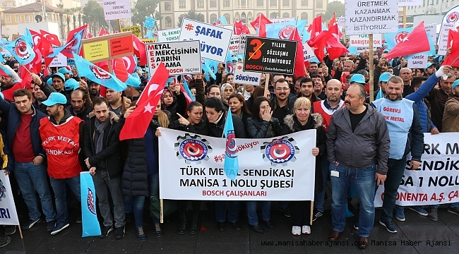 Dün bir araya gelen MESS ile Türk Metal Sendikası görüşmelerinde sonuç çıkmadı. Yüzde 38.2'lik artış isteyen Türk Metal Sendikası'nın teklifine karşı MESS'in yüzde 6.4'lük teklif verdi. Arabuluculuktan da sonuç alınamamasıyla Türk Metal Sendikası eylem yapma kararı aldı. Türk Metal Sendikası Manisa 1 Nolu Şubesi'ne bağlı işçiler Manisa Cumhuriyet Meydanında toplandı. İşçiler ellerinde Türk Bayrakları ve "Üretmek, kazanmak, kazandırmak istiyoruz", "İnsana sevgi, emeğe saygı", "Yıllık sözleşme istemiyoruz", "Metal emekçisinin sabrını sınama" gibi sözler yazan dövizlerle eylem yaptı.