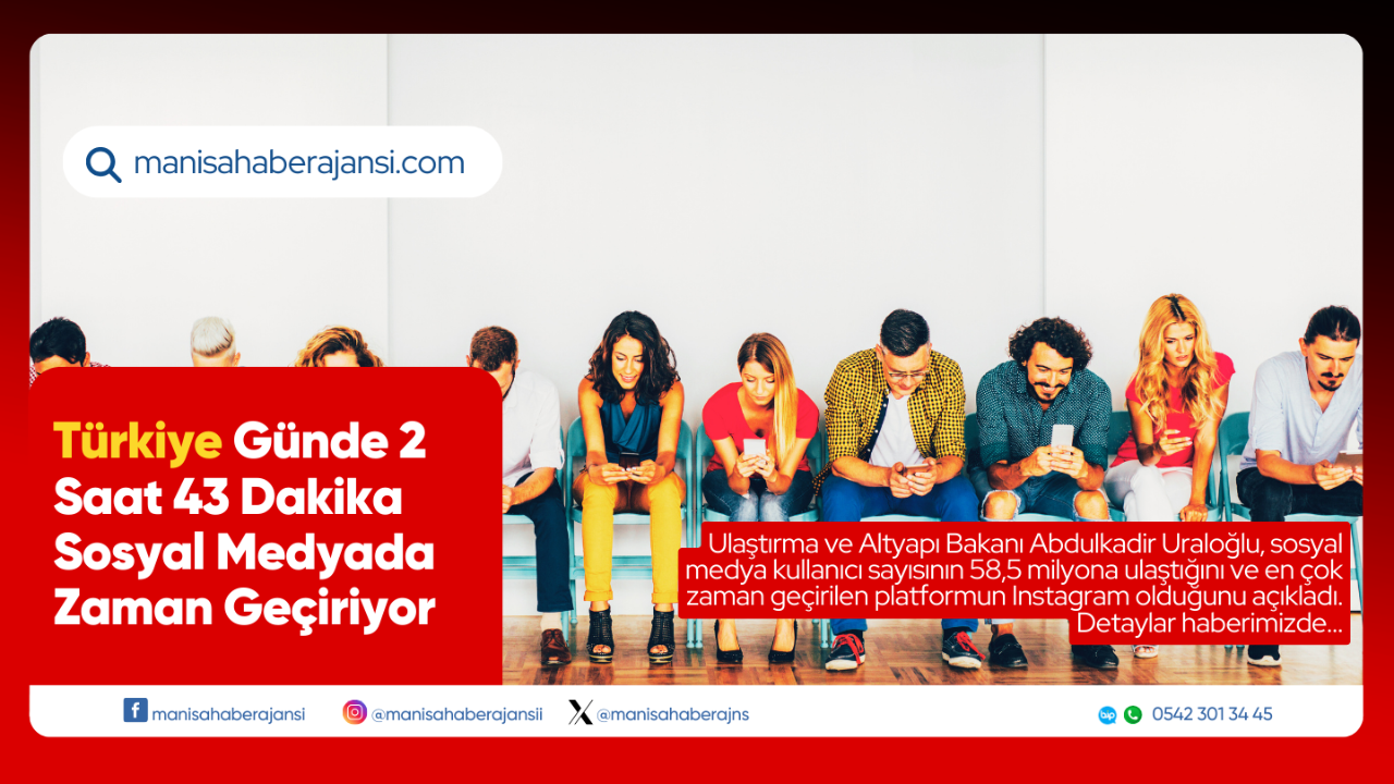 Türkiye’de sosyal medya kullanımı hızla artıyor. Ulaştırma ve Altyapı Bakanı Abdulkadir Uraloğlu, We Are Social ve Meltwater iş birliğiyle hazırlanan “Dijital 2025 Türkiye Raporu”ndaki çarpıcı verilere dikkat çekti. Rapora göre, Türkiye'de internet kullanan kişi sayısı 77,3 milyona ulaşırken, sosyal medya kullanıcı sayısı son bir yılda yüzde 1,7 artarak 58,5 milyona yükseldi.