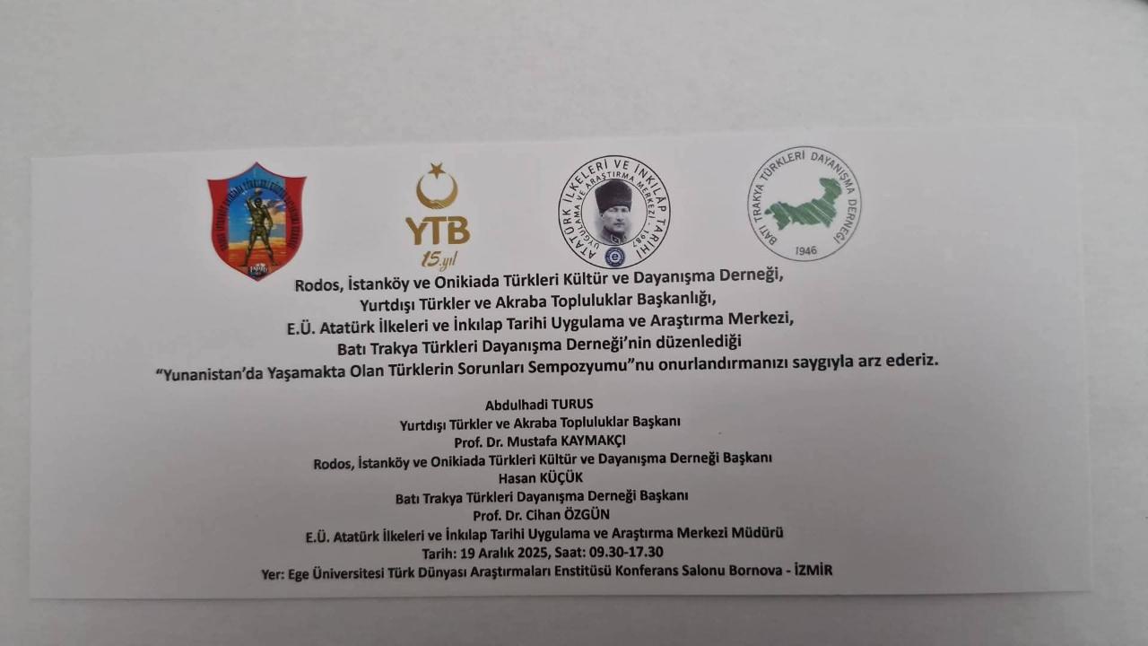 İzmir, 19 Aralık 2025 tarihinde çok önemli bir akademik buluşmaya ev sahipliği yapmaya hazırlanıyor. Rodos, İstanköy ve Onikiada Türkleri Kültür ve Dayanışma Derneği (ROİSDER), Batı Trakya Türkleri Dayanışma Derneği, Ege Üniversitesi ve Yurtdışı Türkler ve Akraba Topluluklar Başkanlığı (YTB) iş birliğiyle "Yunanistan’da Yaşamakta Olan Türklerin Sorunları Sempozyumu" gerçekleştirilecek. Ege Üniversitesi Türk Dünyası Araştırmaları Enstitüsü Konferans Salonu’nda düzenlenecek olan etkinlik, sabah 09.50’de başlayarak gün boyu sürecek.