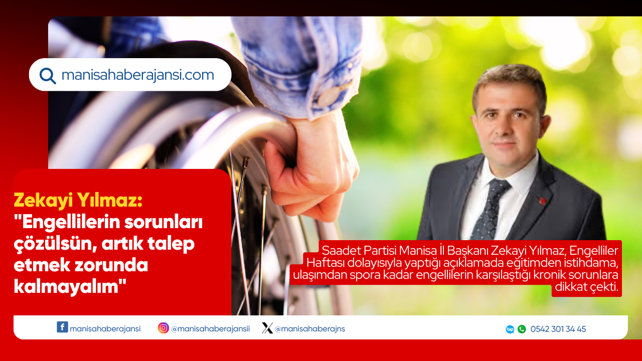 Saadet Partisi Manisa İl Başkanı Zekayi Yılmaz, Engelliler Haftası vesilesiyle yazılı bir basın açıklaması yayımlayarak, engellilerin yıllardır çözülemeyen temel sorunlarını gündeme taşıdı. Yılmaz, Türkiye nüfusunun yaklaşık %12,29’unun engelli bireylerden oluştuğunu belirterek, aileleriyle birlikte bu kitlenin 30-40 milyon kişiye ulaştığını ifade etti. “Bu, toplumun çok büyük bir kısmını doğrudan etkileyen bir mesele ve artık ertelenemez” dedi.