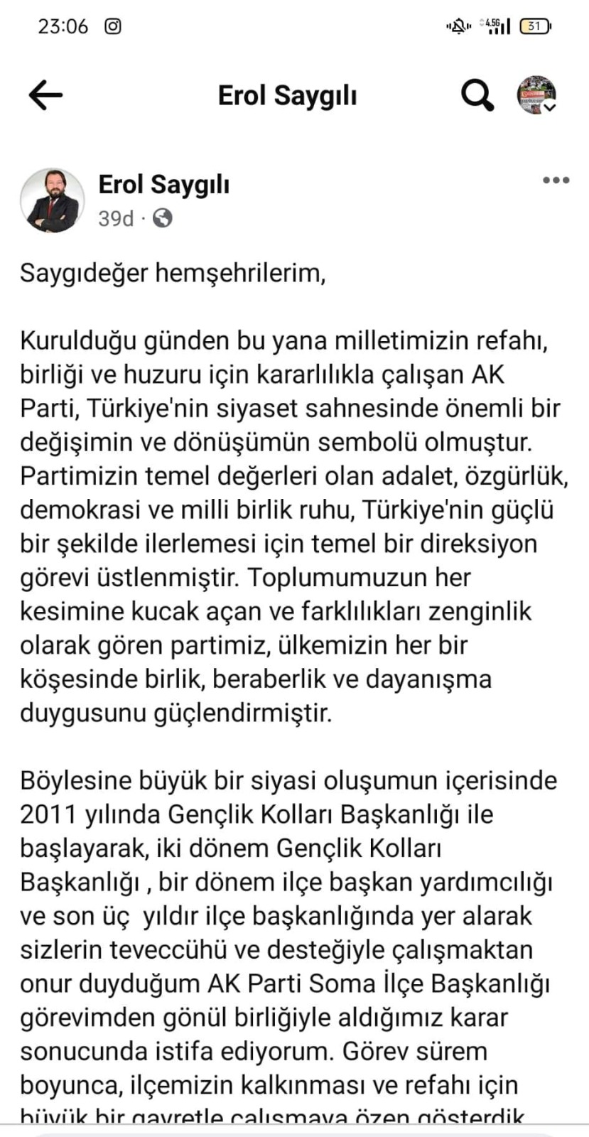 Böylesine büyük bir siyasi oluşumun içerisinde 2011 yılında Gençlik Kolları Başkanlığı ile başlayarak, iki dönem Gençlik Kolları Başkanlığı , bir dönem ilçe başkan yardımcılığı ve son üç yıldır ilçe başkanlığında yer alarak sizlerin teveccühü ve desteğiyle çalışmaktan onur duyduğum AK Parti Soma İlçe Başkanlığı görevimden gönül birliğiyle aldığımız karar sonucunda istifa ediyorum. Görev sürem boyunca, ilçemizin kalkınması ve refahı için büyük bir gayretle çalışmaya özen gösterdik. Projelerimiz ve hedeflerimiz doğrultusunda birçok başarı elde ettik. Birlikte yürüdüğümüz yolculuk boyunca desteklerini esirgemeyen başta Sayın Genel Başkanımıza, İl Başkanımıza ve tüm hemşehrilerimize teşekkürlerimi iletiyorum.