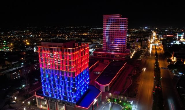 dolayısıyla hizmet binasını, kırmızı-mavi led aydınlatmalar ve Türk Bayrağı yansımalarıyla