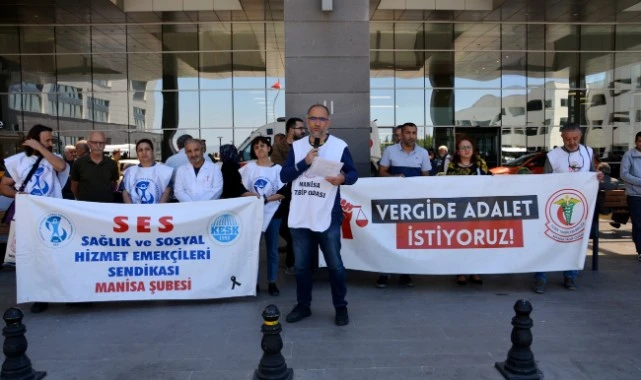 Manisa’da sağlık çalışanları vergide adalet eyleminin 11.sini gerçekleştirdi. Her Çarşamba günü gerçekleşen eyleme Manisa Tabip Odası, SES, Hekimsen, Hekim Birliği Sendikası, Birlik ve Dayanışma Sendikası destek veriyor.